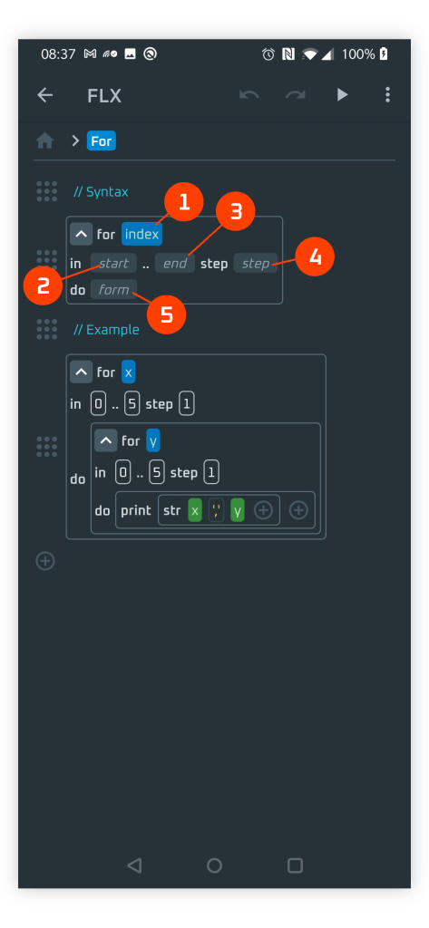 Function for executes the for the indices defined by start index, end index, and step arguments. Both the start and the end indices are inclusive. The index variable is assigned to the current index value before executing the loop form. The last evaluated value of the loop form is returned as an expression value for invoking the for function.