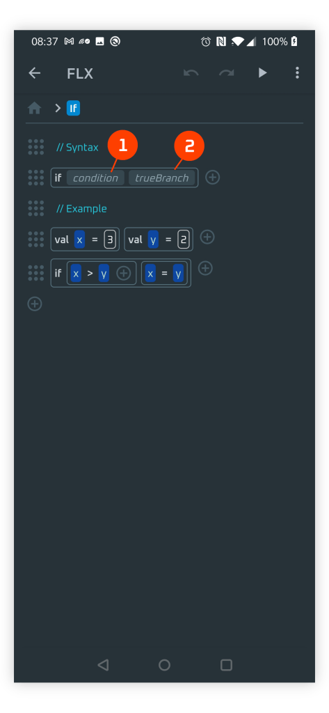 Function if-else evaluates the given condition. If it evaluates to true, then the true branch form is evaluated and returned as expression value from invoking the if-else function. Otherwise the false branch is evaluated and the result is returned.