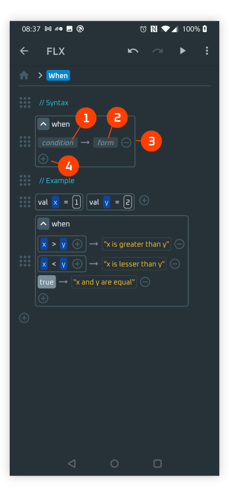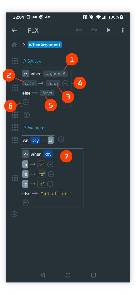 Function when with an argument defines a conditional expression with multiple branches. It is similar to the switch statement in C-like languages. The case form of each branch is evaluated, and if the resulting value matches to the argument value, the branch form is evaluated and the value is returned as an expression value for the when function invocation. If none of the case values matches to the given argument, the form of else branch is evaluated and returned as expression value.