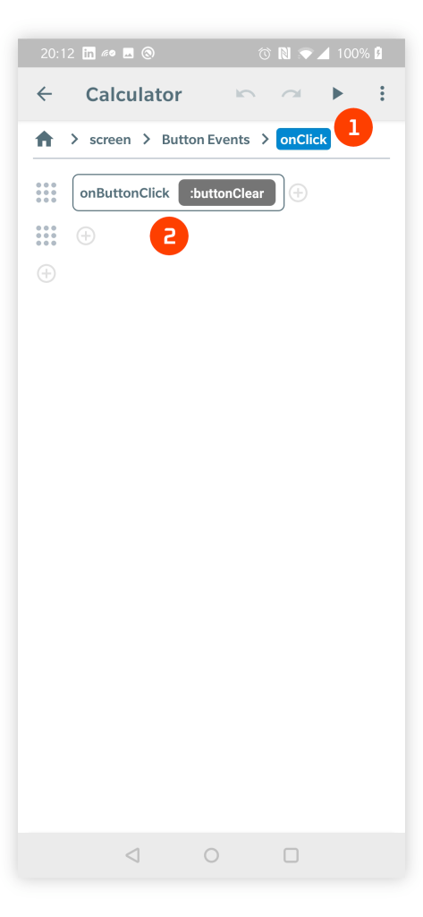 - Program Navigation Bar indicating that we are defining the onClick event handling of a Button widget. The handler in this example is defined to invoke function onButtonClick(buttonId) which is defined elsewhere in the Calculator project.