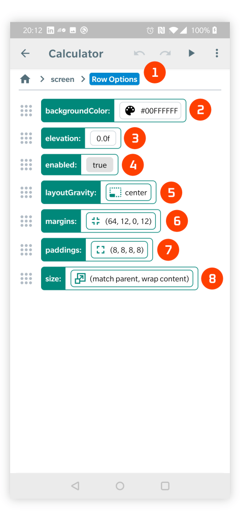 - The backgroundColor property of Row. To edit this or any other widget property value just click on the value form.