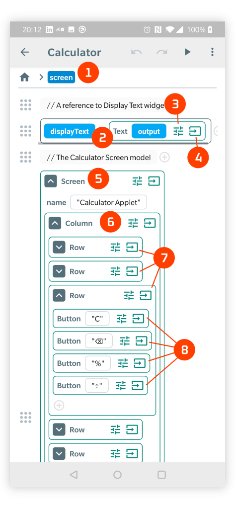 - Each Row in this Screen contains one or more widgets, such as Buttons.