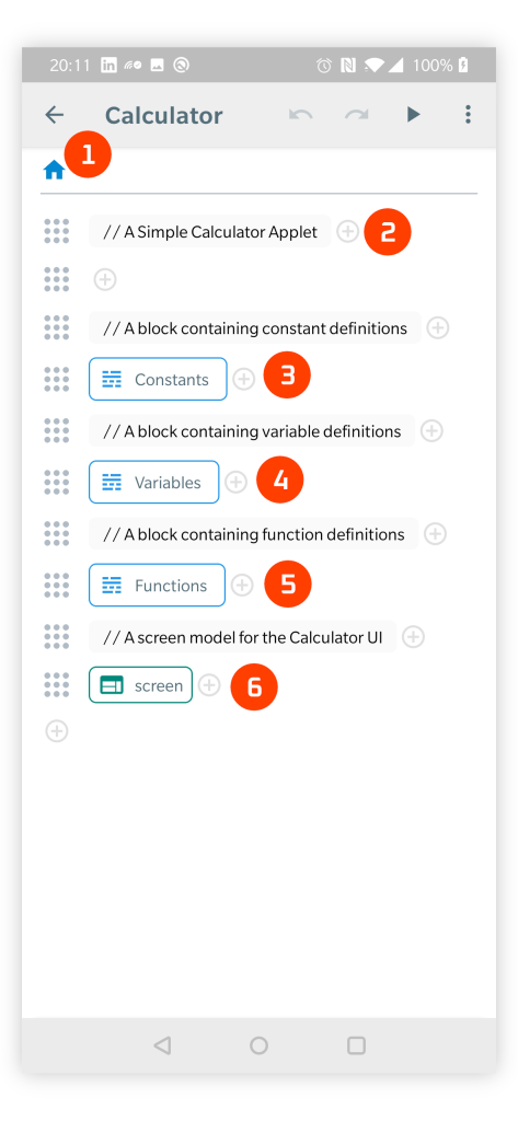 For each screen a Screen Form has to be added to visual code. Below is the top level of the visual code for the Calculator demo: