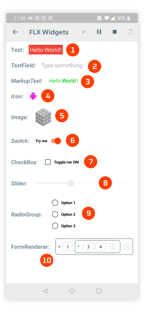 | FormRenderer | A special widget that can be used to render a literal FLX form, such as (+ 1 2 (* 3 4)), as a visual FLX form component. |