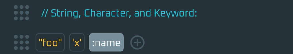 String, Char, and Keyword. String and Char are from Kotlin. Keyword is from Lisp and always represent itself and evaluates to itself.
