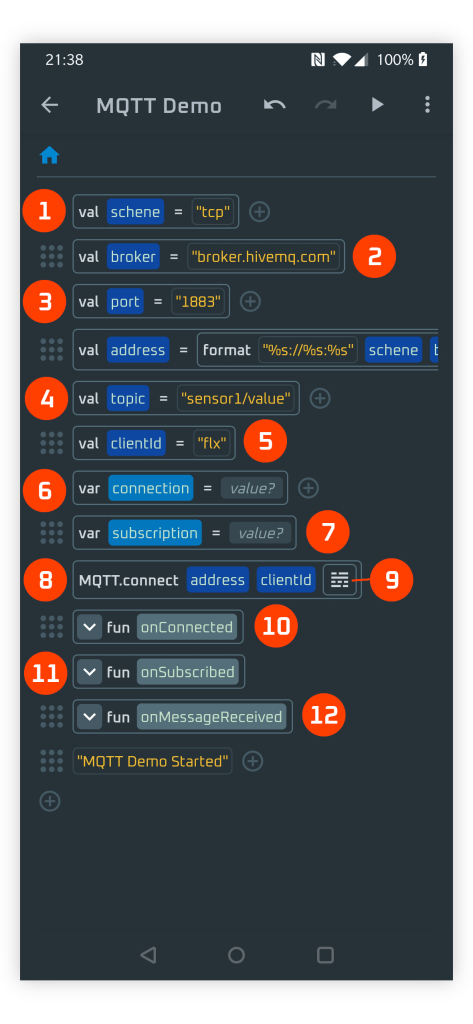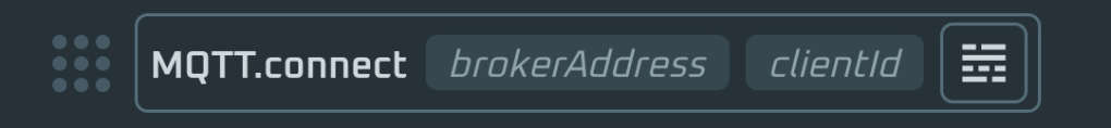 brokerAddress– aStringspecifying the broker address. Address consists of a scheme, a broker host address, and a port number. E.g.:"tcp://broker.hivemq.com:1883"clientId– aStringspecifying an arbitrary client ID of choice, e.g."flx_client"connectionCallback– theconnectfunction is asynchronous, so a callback is needed. The callback is defined as a code block. Click the code block icon to open visual code editor for the callback code. The callback provides an input parametereventwhich has a type of one the subclasses ofMqttConnectionEvent.