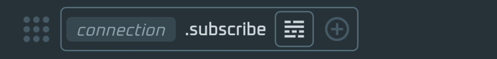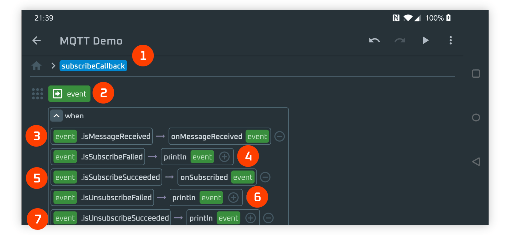 connection– aMqttConnectionrepresenting a connection to a brokersubscriptionCallback– thesubscribefunction is asynchronous, so a callback is needed. The callback is defined as a code block. Click the code block icon to open visual code editor for the callback code. The callback provides an input parametereventwhich is of one the subclasses ofMqttSubscriptionEventtopics– a one or more topics. Each topic is defined asString.
