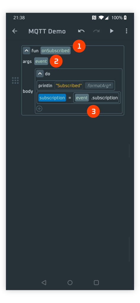 - The MqttSubscription object is obtained from the received event and is stored to variable subscription so that it can be used later on to manage the made subscription.
