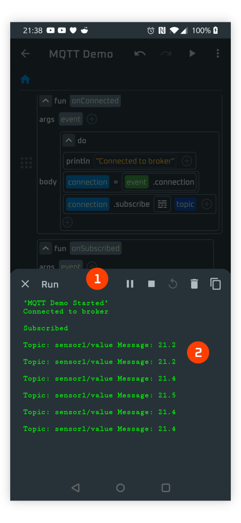 - A code block for defining a subscription callback which is needed for asynchronously receiving receiving subscription related events which are implemented as subtypes of MqttSubscription. (See the implementation of subscription callback below).